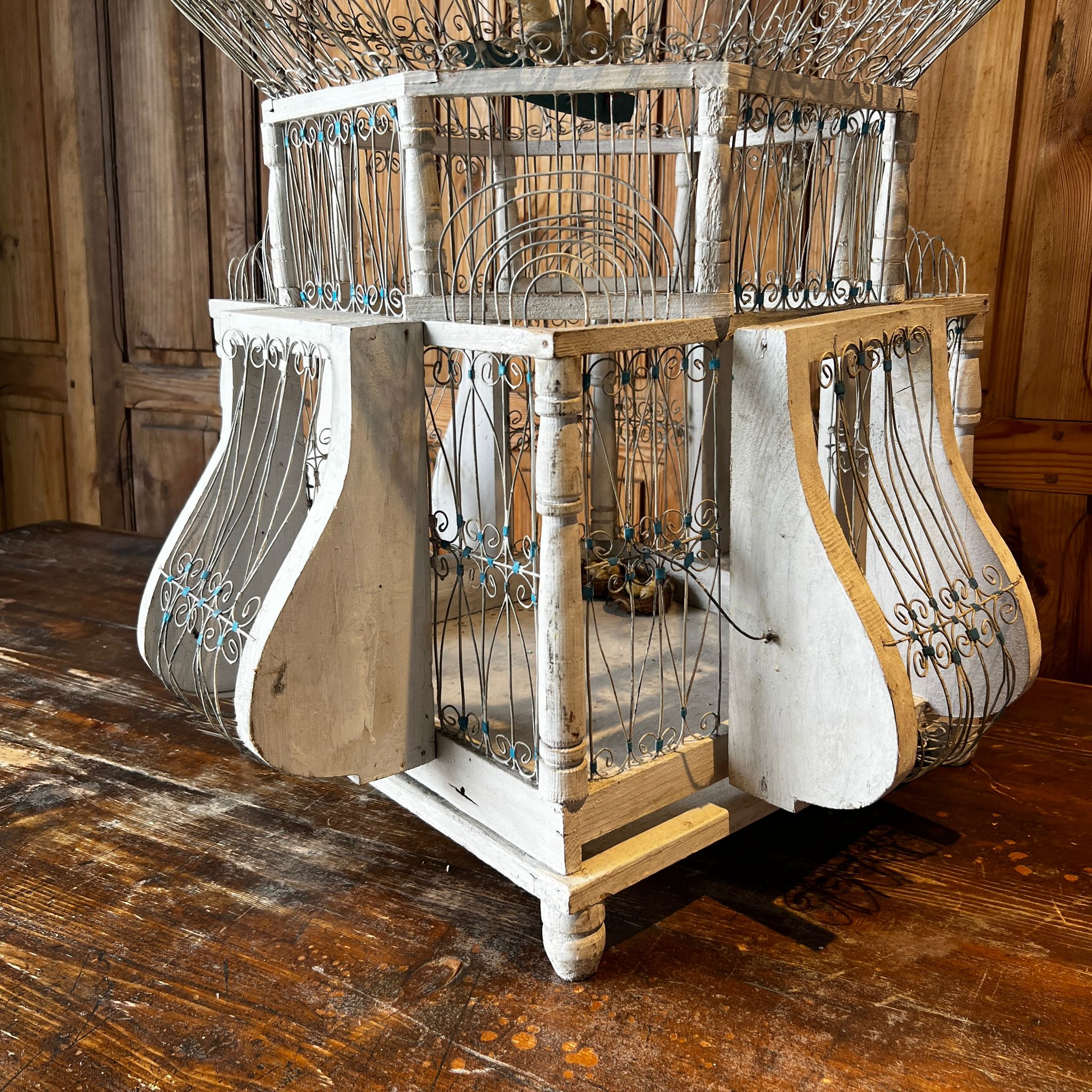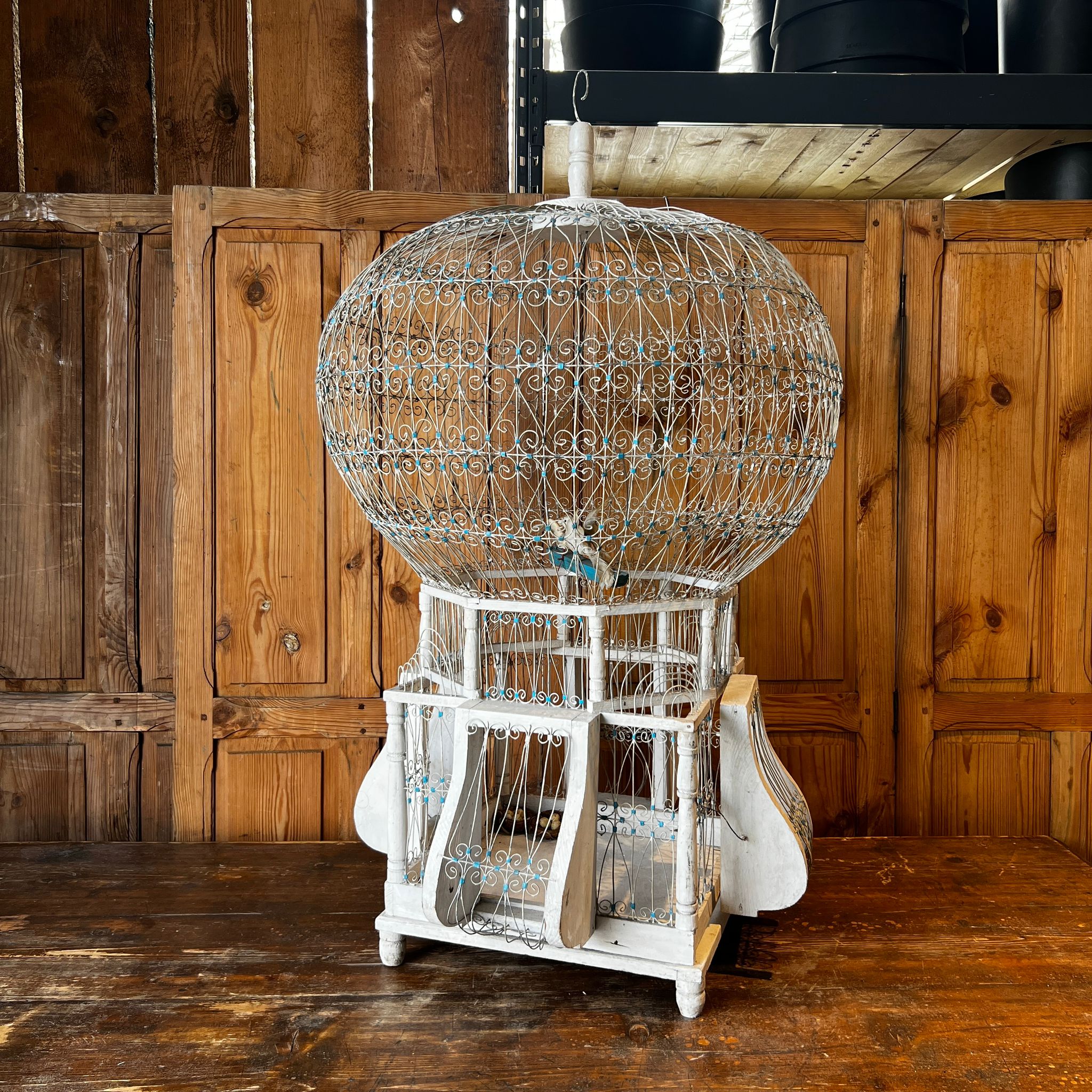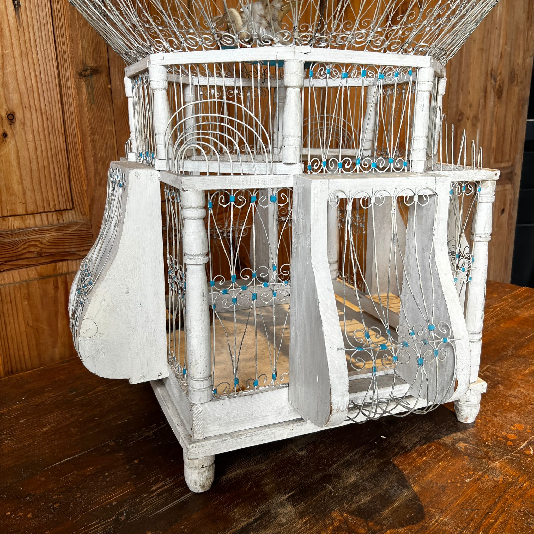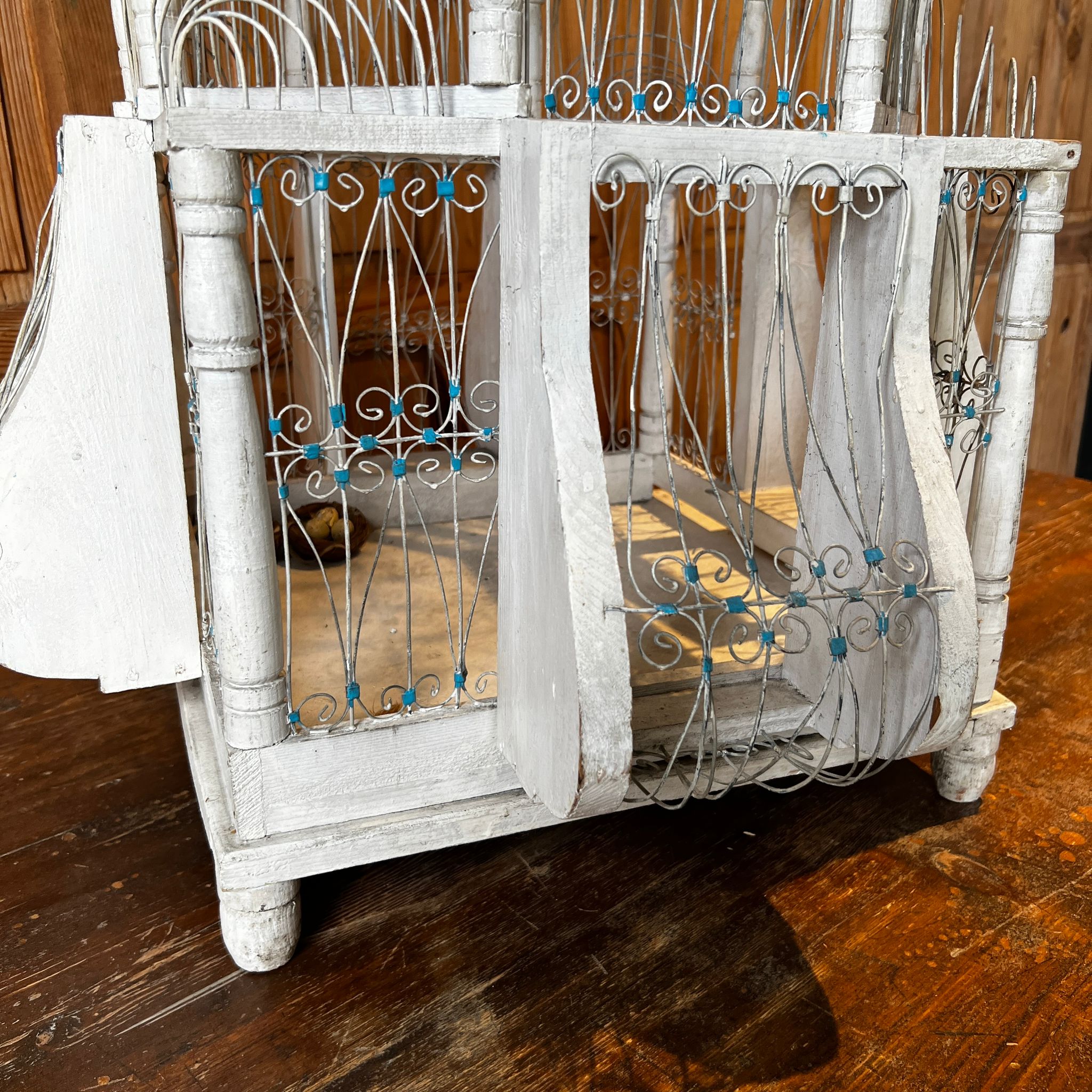 Cage à oiseaux de couleurs blanche et bleue, style oriental en bois et métal.