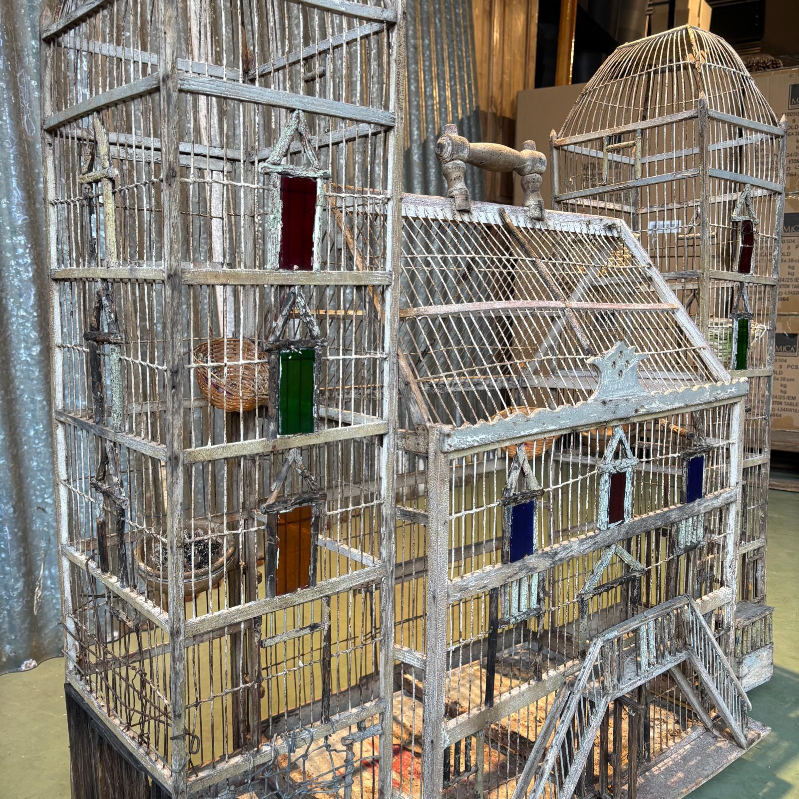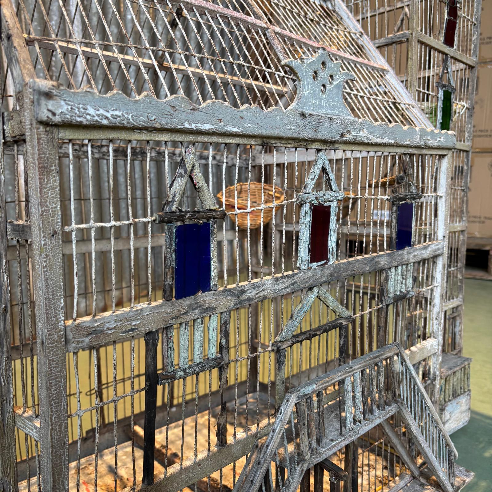 Cage à oiseaux en forme de maison en bois  avec une verrerie colorée.