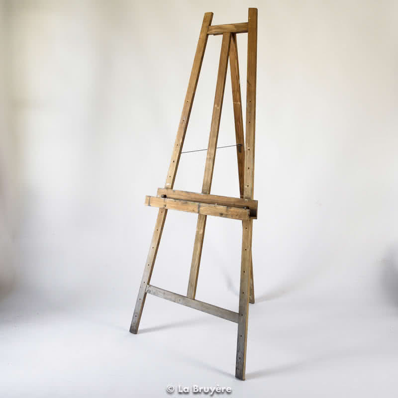 Ancien chevalet de peintre en bois de hêtre clair, réglable et pliable, pouvant être incliné jusqu’à 90°.