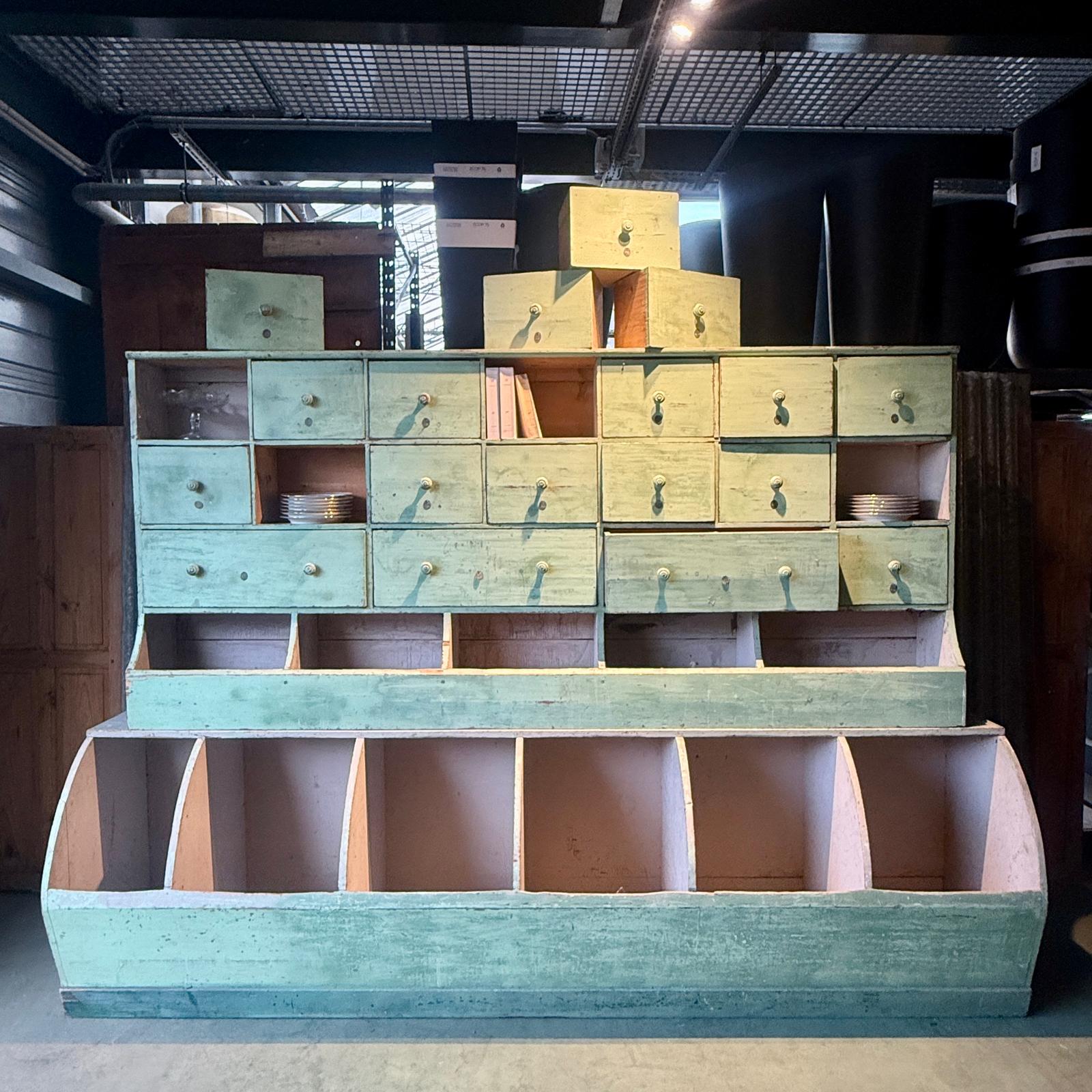 Grand meuble de grainetier. Divers tiroirs et étagères.